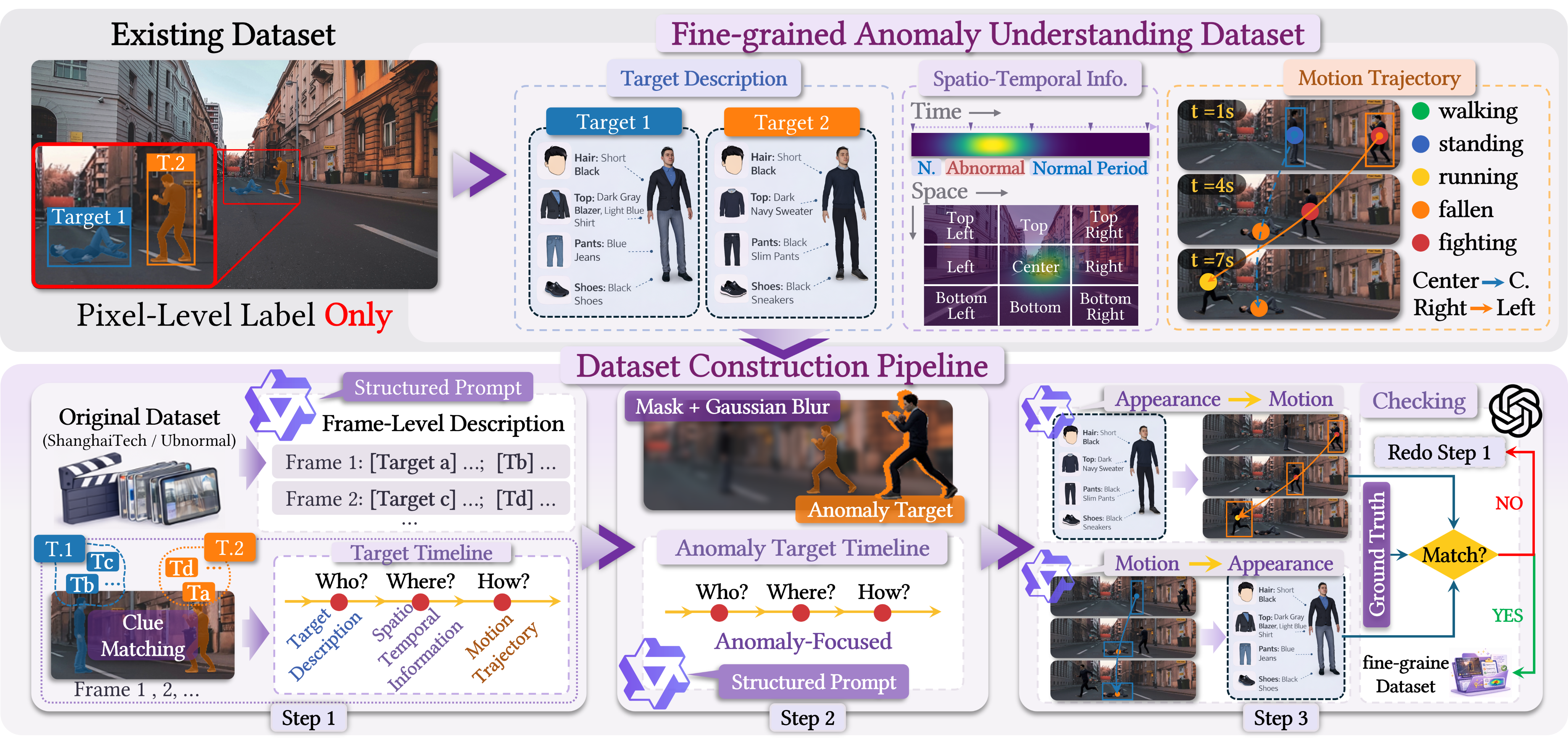 Fine-grained anomaly dataset construction pipeline. Starting from existing datasets with only pixel-level anomaly labels (e.g., ShanghaiTech and UBnormal), we build a structured video–text dataset through three stages: