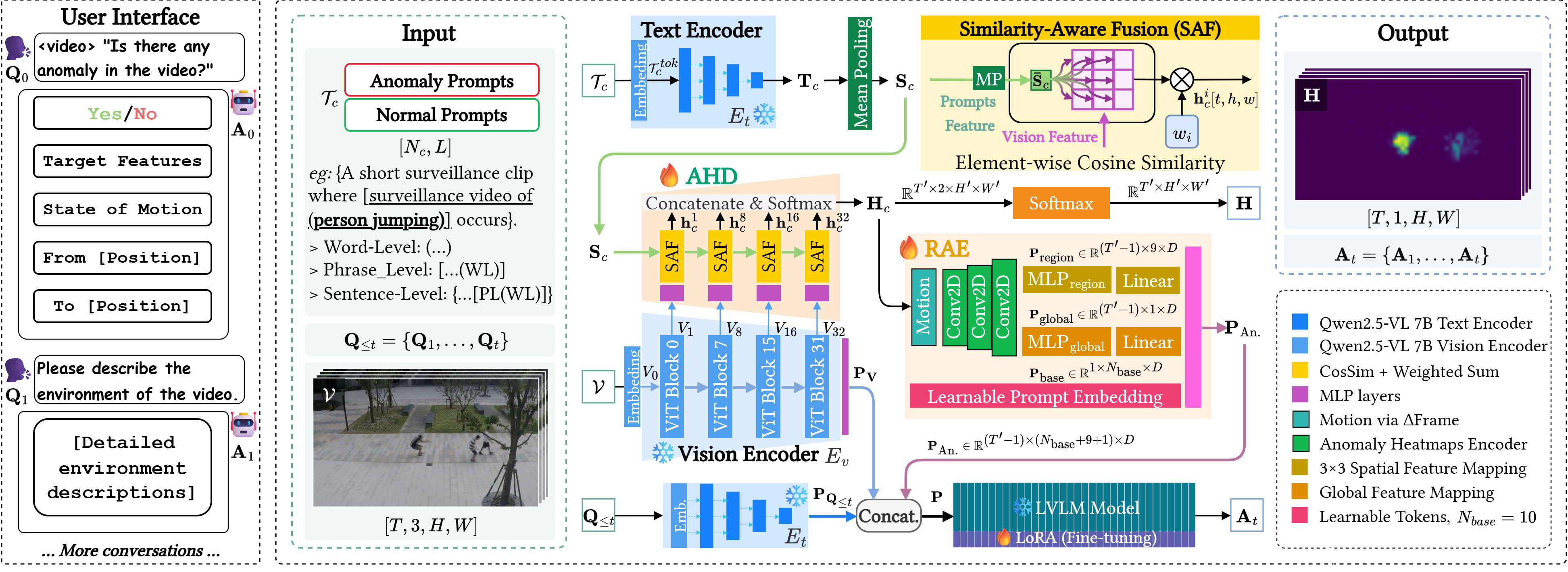 Region-aware Anomaly Encoder (RAE) that projects \(\mathbf{H}_c\) into the LoRA-tuned LVLM semantic space and integrates it with video \(\mathcal{V}\) and a sequence of incrementally refined questions \(\mathbf{Q}_{\leq t}\) to yield the final anomaly understanding response \(\mathbf{A}_t\)