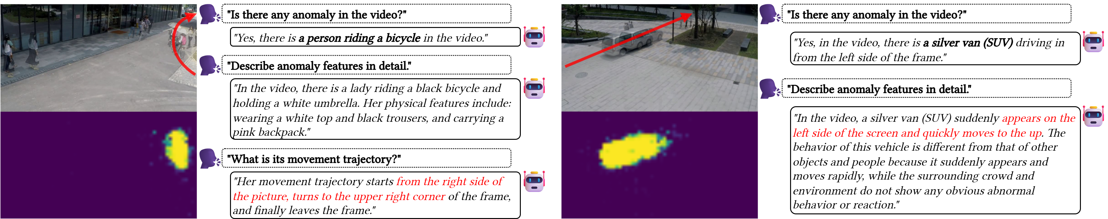 Left: a cyclist (with umbrella and backpack) is localized as the anomalous target, with the trajectory “enter from right \(\rightarrow\) turn toward the upper-right corner \(\rightarrow\) exit.”