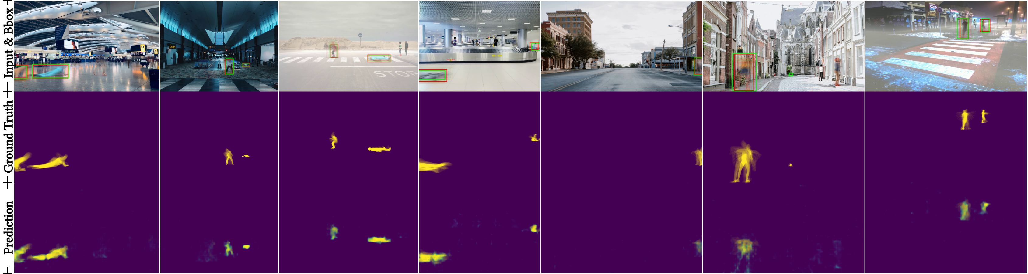 Trajectory visualization by accumulating frame-level outputs. The first row shows multi-frame overlays of the original video with green bounding boxes for GT and red bounding boxes for predictions. The second row overlays GT pixel-level masks to form fine-grained trajectories, while the third row overlays predicted pixel-level masks. Both bounding-box and pixel-level trajectories show strong spatial alignment with GT, indicating that our model accurately captures motion paths over time.